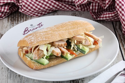 Softiges Ciabatta belegt mit warmen Hähnchenfiletstreifen, Gurke, Paprika und etwas Schafskäse